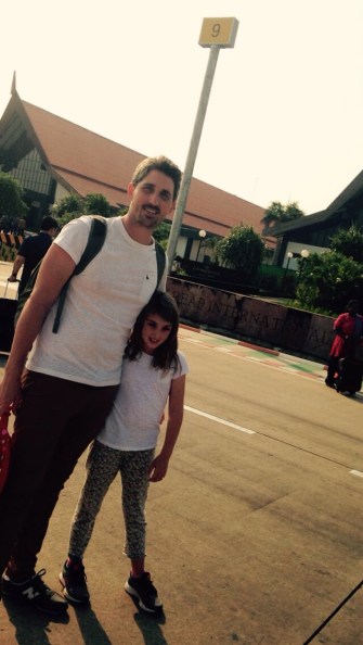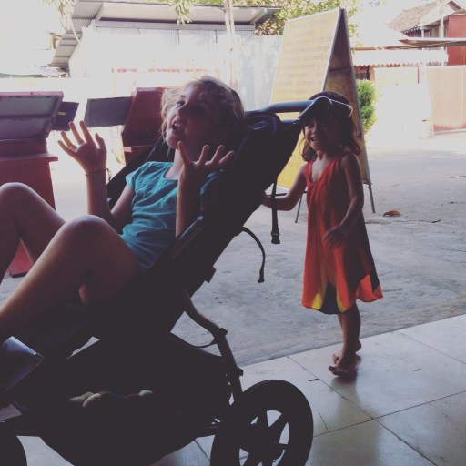 We dutifully filled out our visa applications, handed them over with our two extra passport photos and a wad of cash. A guy behind the counter spotted us and ushered Tim further forward. Pointing at me and the children he hollered “this your family?” (My heart sunk! Has Monty just peed on a shrine without me noticing??), Tim nodded and we had our passports taken off us and were whisked through to baggage collection and told to wait. Brucey bonus, we missed all the queues! We pointed and laughed at everyone else waiting in line and the children bickered some more while all our paperwork was sorted for us. We collected our bag, as the man scurried over with our passports. He looked at Tim’s wallet and said “tip”, so we handed him a dollar and he skipped away, happy as a pig in mud! So, anyone travelling to Cambodia, fan yourself with your cash in the airport and hope that same little guy spots you!