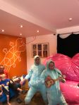 Once the ukulele was put away, and the kids had sorted if they were a protein, a fat or a sugar, (amazed that we grasped that one straight away) the children were ‘ingested‘ into a massive, anatomically correct (well, kinda), inflatable, human digestive tract. The ‘food’ is guided through it’s digestion by the Blabbermouthed Belly Bacteria and shown every detail as this gut turns food into energy. The large intestine (approx. 30 meters) is big enough to ‘stoop walk’, but you absolutely need to crawl through the small intestine (approx. 80 meters). Poppy loved it; I was a little clammy, but once I was in, and there was no going back, I was happily making my way toward the back passage like a well digested marshmallow!!